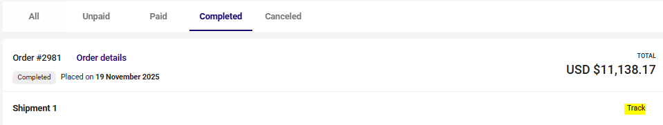 Depending on your location and the shipping options you selected, shipments will take in average 1-14 business days to be delivered. Please follow-up on the delivery status directly on the chosen carrier's website once the order is on your "Completed" orders' tab, by clicking on the "Track" link (see below):